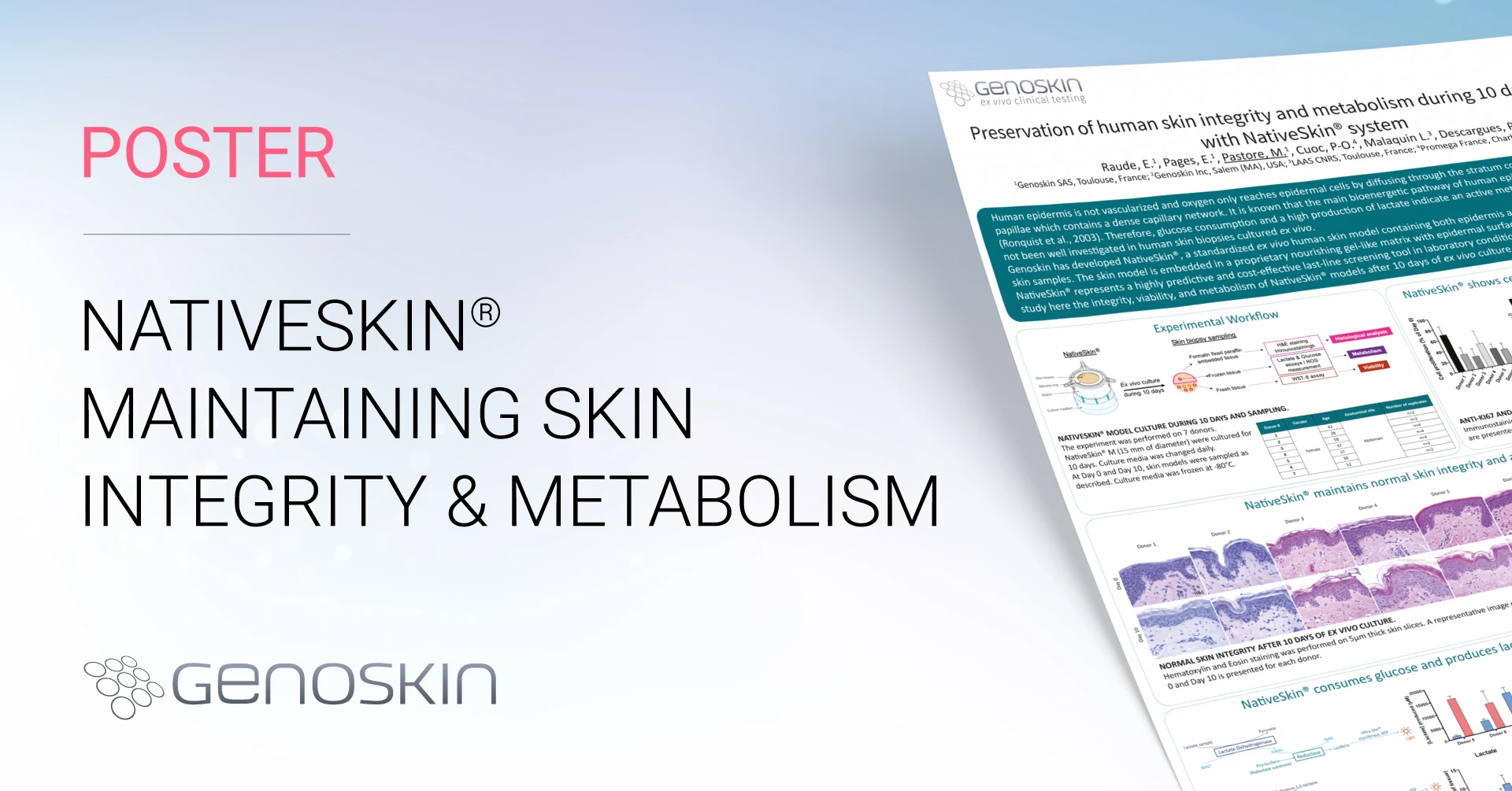 Human epidermis is not vascularized and oxygen only reaches epidermal cells by diffusing through the stratum corneum or from the dermal papillae which contains a dense capillary network. It is known that the main bioenergetic pathway of human epidermis is anaerobic glycolysis (Ronquist et al., 2003). Therefore, glucose consumption and high production of lactate indicate an active metabolism in the skin. This pathway has not been well investigated in human skin biopsies cultured ex vivo. Genoskin has developed NativeSkin®, a standardized ex vivo human skin model containing both epidermis and dermis, produced with discarded skin samples. The skin model is embedded in a proprietary nourishing gel-like matrix with the epidermal surface left in direct contact with the air. NativeSkin® represents a highly predictive and cost-effective last-line screening tool in laboratory conditions prior to in vivo clinical evaluations. We study here the integrity, viability, and metabolism of NativeSkin® models after ten days of ex vivo culture.